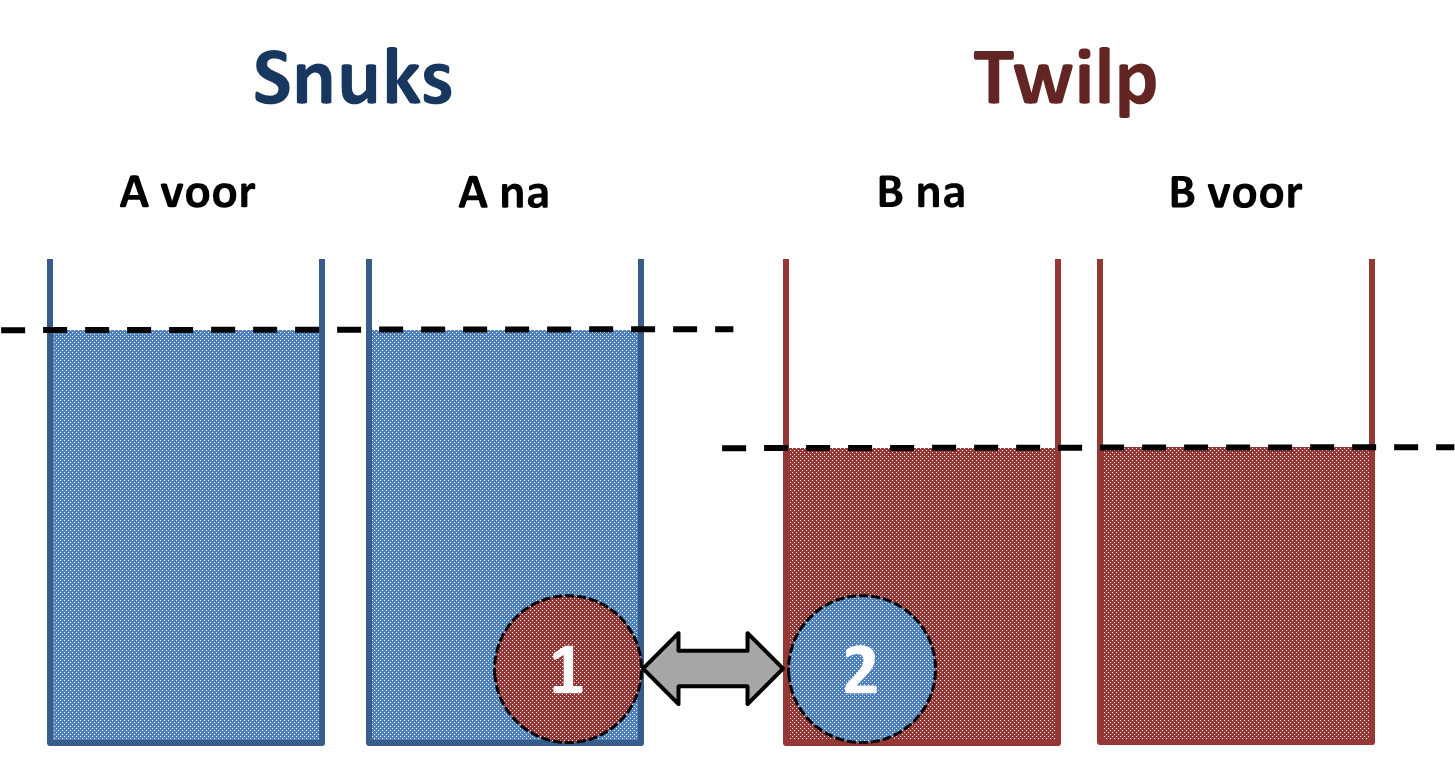 De vraag is: zit er in absolute zin (dus in liters) nu meer snuks in het vat waar oorspronkelijk alleen twilp in zat (vat B), of meer twilp in het vat waar oorspronkelijk alleen snuks in zat (vat A), of is het even veel?